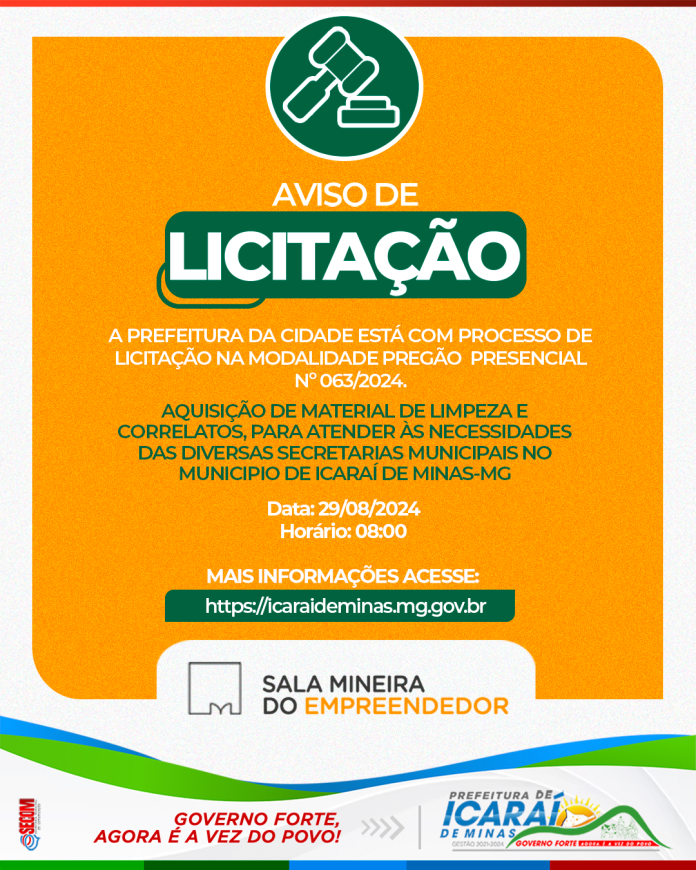 A Prefeitura de Icaraí de Minas informa que está em andamento o processo de licitação para aquisição de material de limpeza e correlatos, com o objetivo de atender às demandas das diversas secretarias municipais.