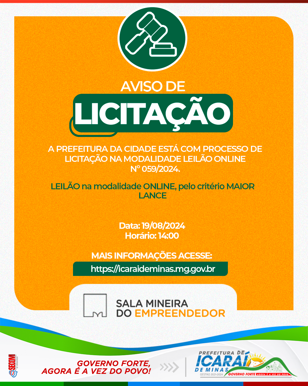 A Prefeitura Municipal de Icaraí de Minas informa que está com processo de licitação aberto na modalidade Leilão Online, sob o nº 059/2024, pelo critério de maior lance.