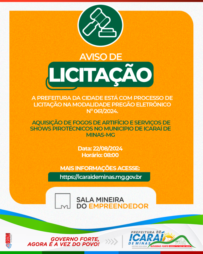 A Prefeitura Municipal de Icaraí de Minas comunica que está aberto o processo de licitação na modalidade pregão eletrônico nº 061/2024, destinado à aquisição de fogos de artifício e contratação de serviços de shows pirotécnicos.