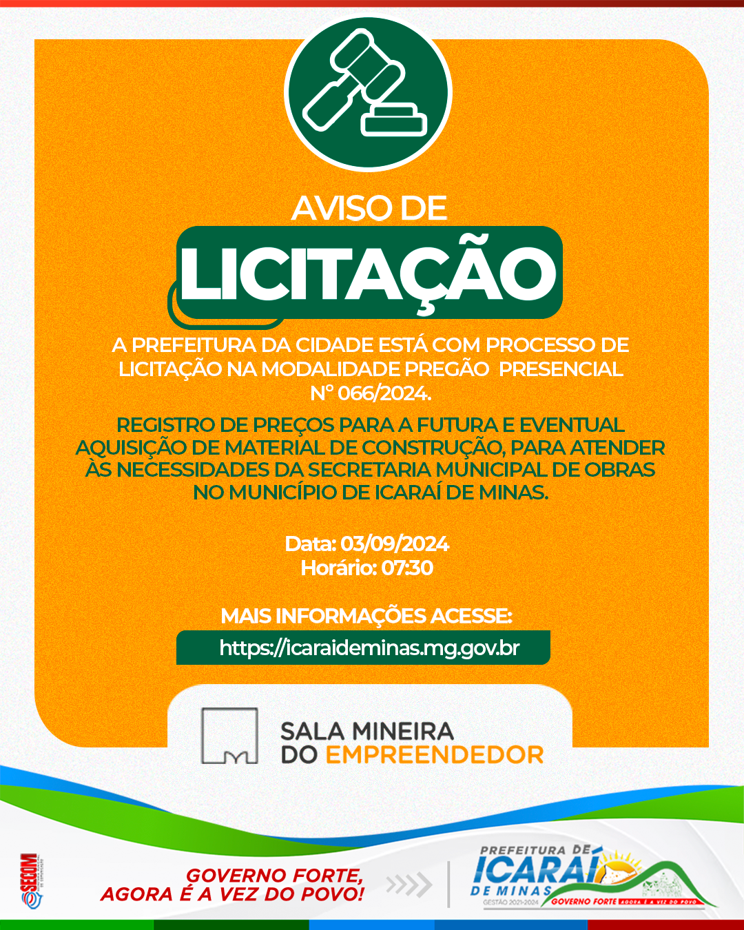 A Prefeitura de Icaraí de Minas comunica a abertura de licitação para registro de preços com o objetivo de futura e eventual aquisição de materiais de construção. Esse processo visa atender às necessidades da Secretaria Municipal de Obras. O pregão presencial ocorrerá no dia 03/09/2024, às 07h30.