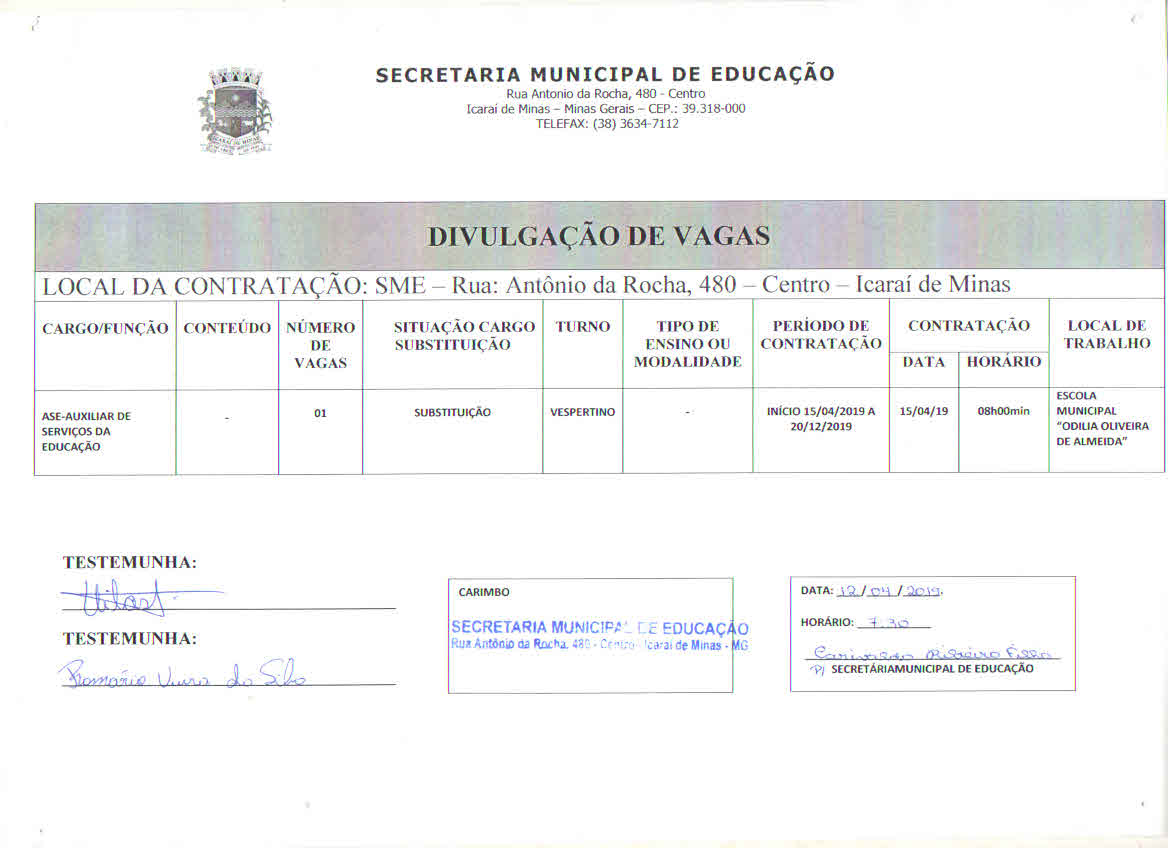 LOCAL DA CONTRATAÇÃO: SME – Rua: Antônio da Rocha, 480 – Centro – Icaraí de Minas